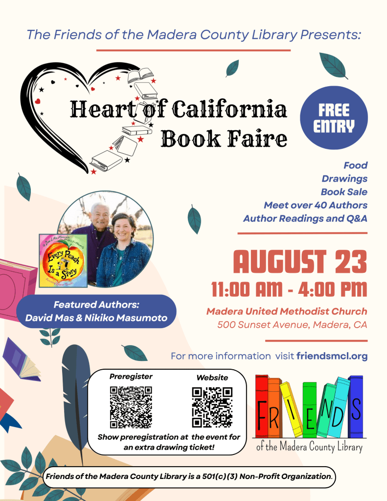 Join me and more than 40 other local authors one month from today! The second annual Heart of California Book Faire will be held August 23, 2025 at the Madera United Methodist Church in Madera. Doors open at 11 and close at 4pm. Meet local authors, get your books signed (or buy some books if you haven’t already), and listen to selected authors read from their own works. There will also be author panels where you can take part in Q&A.