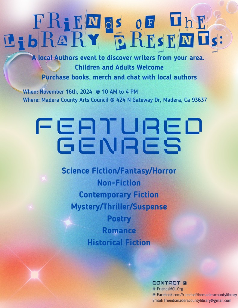 Our next event will be November 16, 2024 at the Madera County Arts Council. We have 44 authors scheduled to sell and sign books, giving you a chance to meet them in person. If you live in central California, why not plan to join us? We look forward to meeting you.